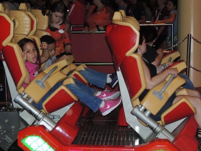 We lounged a little, taking in a Blue Man-type construction music group and the Superstar Parade, then backtracked to the Rip Ride Rocket which the kids had been dying to ride. They were on their own for this one as the DH was afraid he would get motion sick and I can’t do any roller coasters that go upside down. Seriously, in the time it took for me to walk from where I was waiting in line with them to the non-rider section, they were done. The DH and I estimated no longer than 45 seconds. But apparently it was worth it. They squealed with delight the entire time.