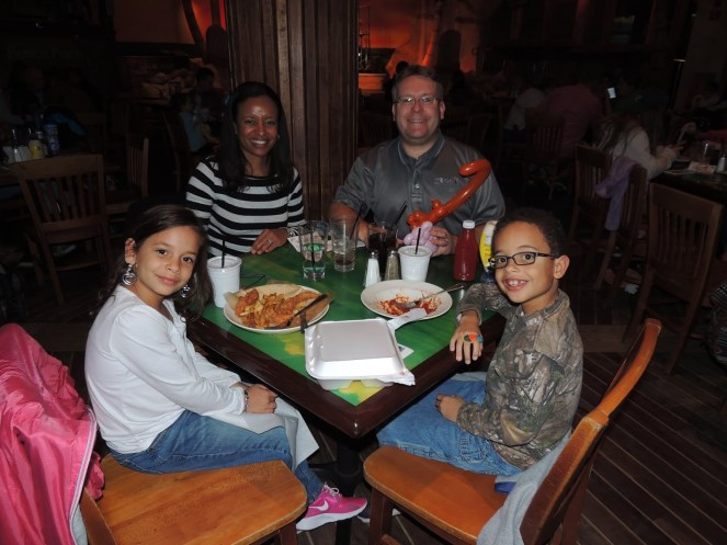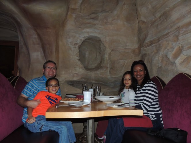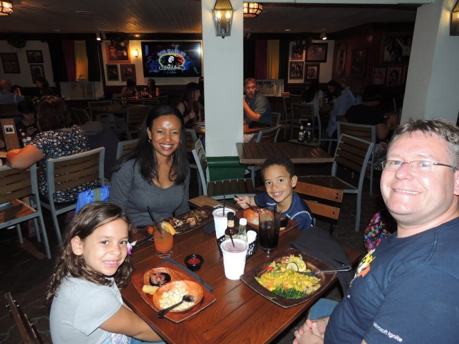 Eventually, we exited the park in favor of dinner at CityWalk. We celebrated our Thanksgiving meal at Bob Marley’s Tribute to Freedom. It was as close as I could get to Bahamian food. The DH had curried shrimp, while I had jerk chicken with rice and peas. The kids had Jamacarooni and cheese. See what they did there? Ha Ha!!