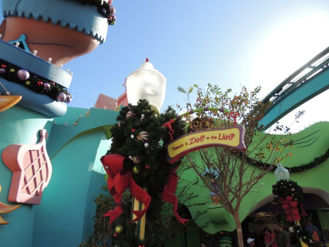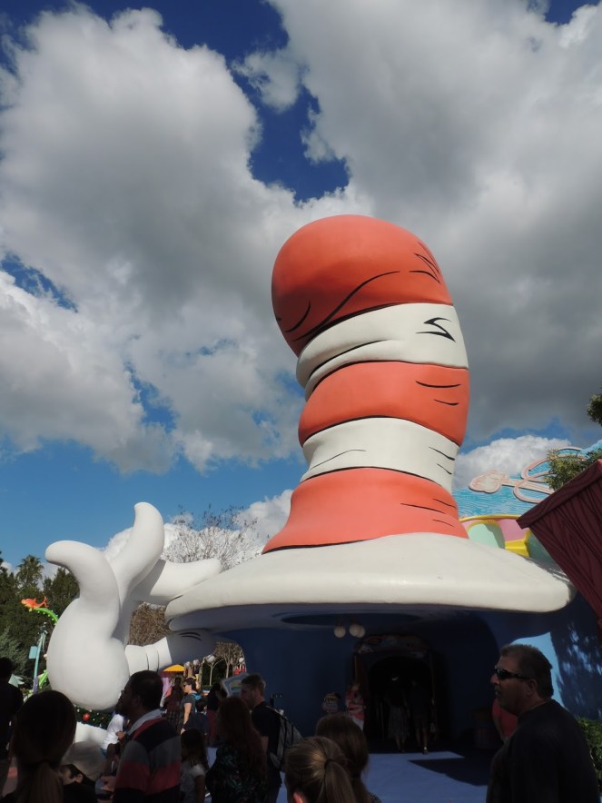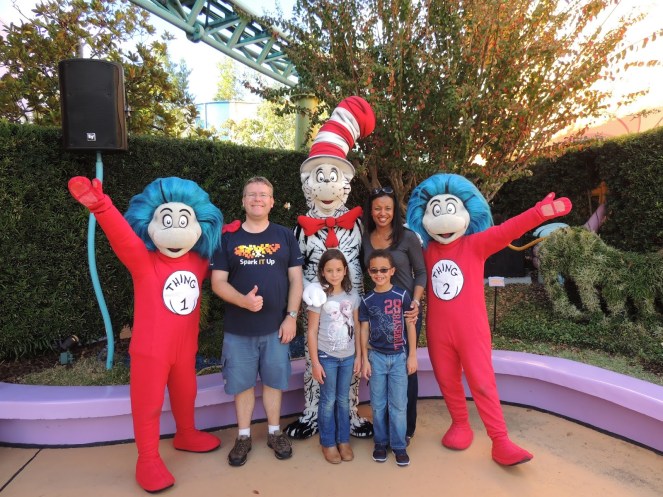 Later, we ventured over to Seuss Landing. Initially, Stinky protested the “baby section,” but you would have never known it. The Cat in the Hat was a nice throwback, we got a little more wet on the One Fish Two Fish Red Fish Blue Fish ride (which the kids rode multiple times), and transformed into Sneetches on the High in the Sky Seuss Trolley Train Ride.