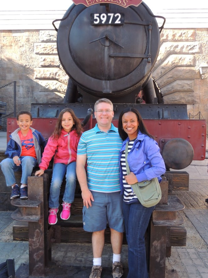 The kids were anxious to visit Diagon Alley, but we managed to hold them off long enough to ride Minion Mayhem, Shrek 4-D, and Transformers 3-D. Stinky and the DH even scored a picture with a Decepticon. Blinky was terrified of its size and wouldn’t go within 20 feet of it.