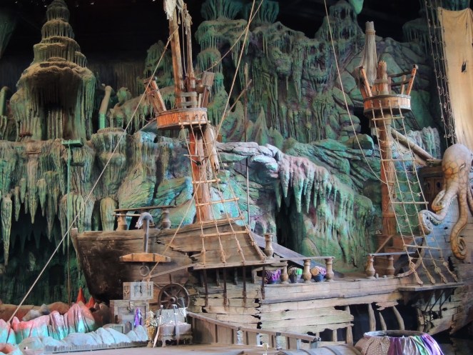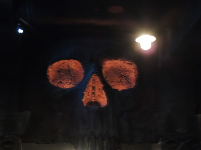 We ventured over the Skull Island to see King Kong. The line meandered into a cave-like structure adorned with skulls and an animatronic witch warning us to stay away in a strange language. There were also rhythmic drums. The kids were petrified! As we moved deeper into a cave, strange creatures reached out of holes in the walls to grab us. Well that did it for the kids. They opted to stay in the family room while the DH I and rode. The build up to the safari ride in the jungle was huge and while the ride was satisfying, I kinda enjoyed the wait in line more. Weird right?