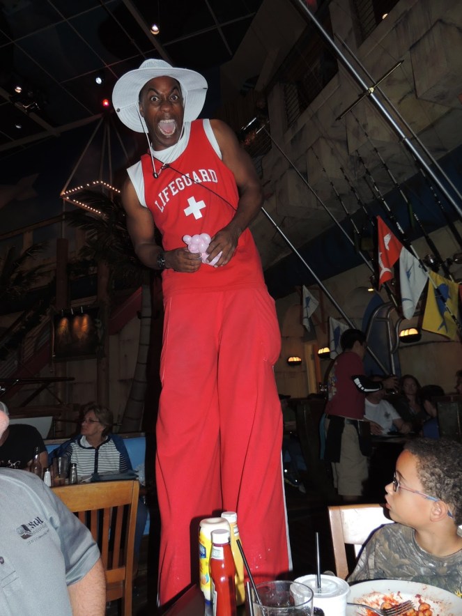We hit the road first thing Sunday morning and made it to Orlando by dinner. After checking in to the luxurious Lowes Royal Pacific, we took a water taxi to CityWalk to dine at Margaritaville. The food was divine and the atmosphere could not have been more festive. Jimmy Buffet music videos played on screens shaped like sails until it was time for the live band to take over. Then in the middle of dinner we were greeted by a balloon animal maker, dressed as a lifeguard on stilts, who made treats for the kids. That was a big hit! We spent a little time exploring more of CityWalk before taking a water taxi back to the resort.