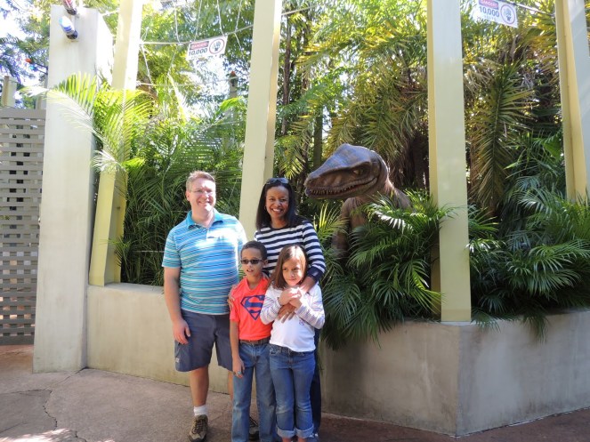 We then headed to the Jurassic Park Discovery Center for the kids to indulge in their pseudo-science games. Stinky loved the interactive game that blended his DNA with that of a dinosaur to produce an entirely new species. He especially loved the facial recognition scan. I remember telling him not to press his lips to the scan, never thinking to mention he shouldn’t take off his glasses!