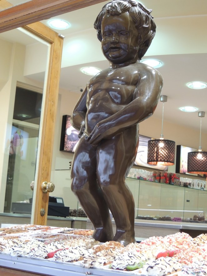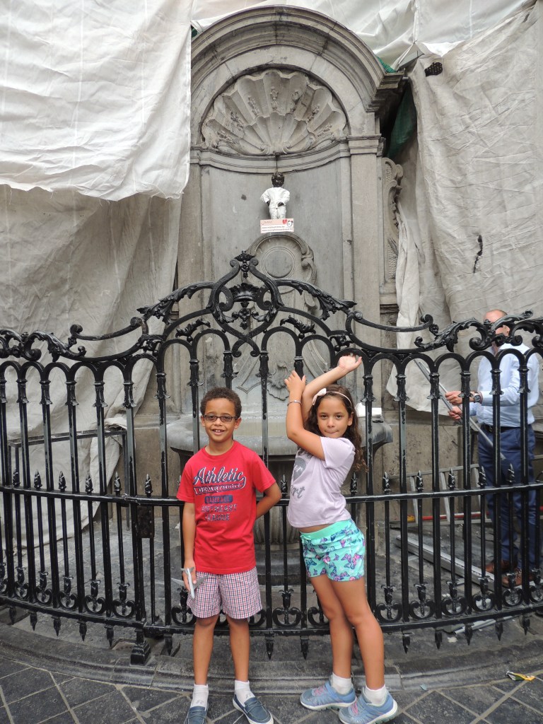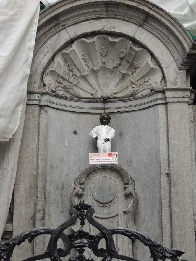 I hinted about our next stop in yesterday’s post. This one was MAJOR for the kids, who had been dying to see the Manneke Pis since we arrived. It is literally a statue of a small boy peeing into a fountain. It is neatly tucked away in a corner of a nondescript street, conveniently surrounded by souvenir shops and waffle bars. Literally hundreds of people blanket the area to take a selfie. When we arrived, Manneke Pis was dressed for Cardiac Awareness Week. His caregiver was just about to change him so much to their delight, Stinky and Blinky got to see him in all his glory.