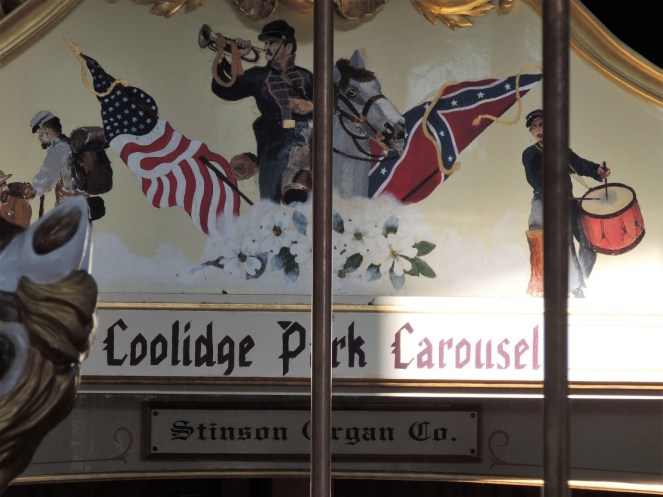 Because it was quite a long drive, our first stop was Coolidge Park to let Stinky and Blinky frolic and for the adults to stretch their legs. They enjoyed the Coolidge Park Carousel, which is an antique carousel featuring “52 whimsical hand carved animals, a calliope band organ, and ornate between gold leaf benches.” The DH and I loved that it was only $1 per ride.