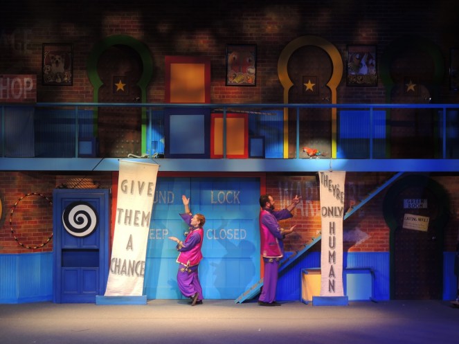We literally had to drag the kids off the rides to make Opening Night Critters. We saw a similar show last year at Sea World and I knew they would enjoy it. See what happens when two ambitious stage hands find themselves sharing the spotlight with more than 100 furry and feathered co-stars. Featuring rescued animals, Opening Night Critters is an over-the-top tale of what can happen when humans and animals come together in kindness, compassion and cooperation. Afterward, we had the opportunity to meet a few of the human and furry stars.