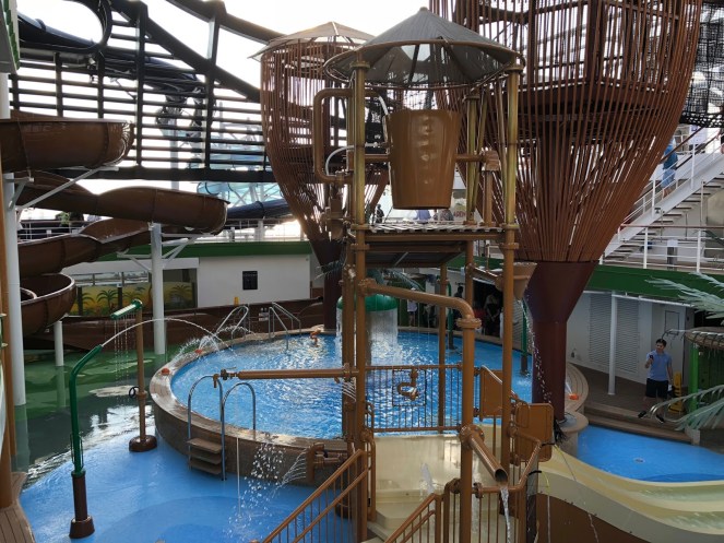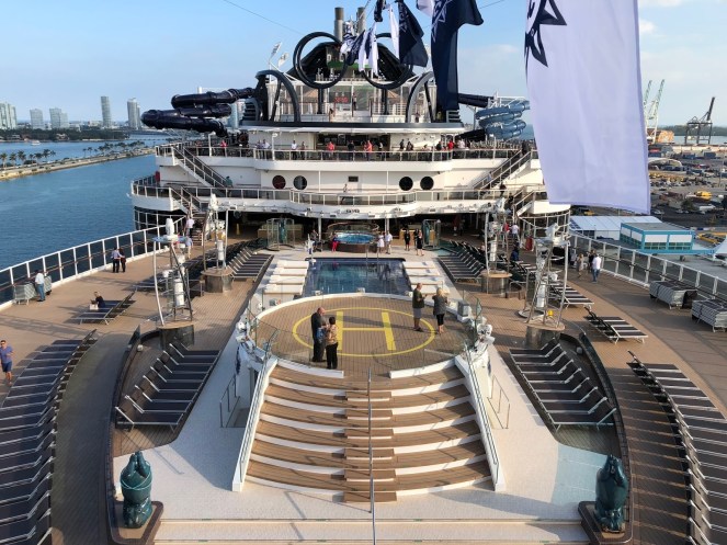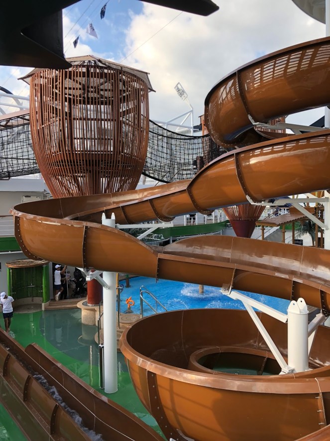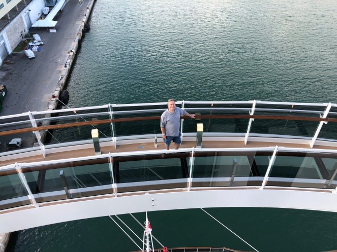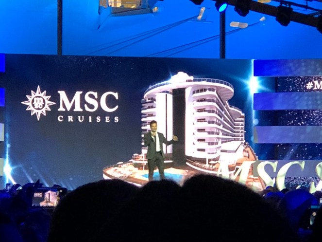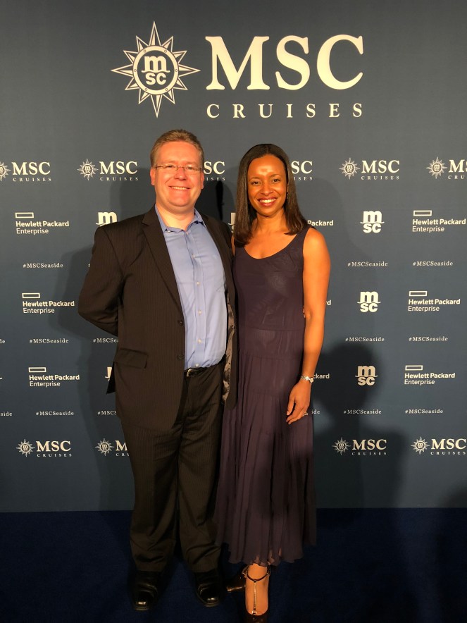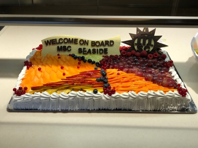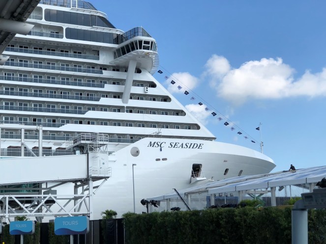 Side note…MSC is an acronym for Mediterranean Shipping Company. (This explains the branding on the cargo vessel docked alongside the MSC Seaside.) MSC is owned by the Aponte Family, whose seafaring vocation has been recorded since 1675! It is a widely recognized brand in Europe and South America. With MSC Divina, MSC Seaside, and 12 new ships on the way, MSC is hoping to establish itself in the North American market.