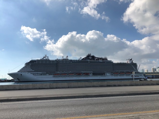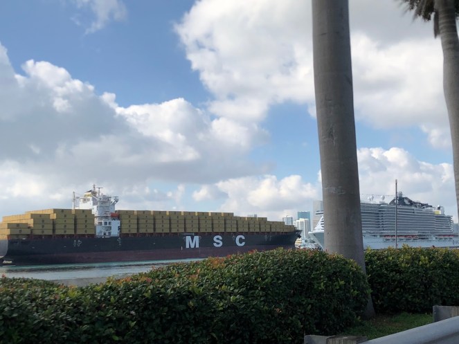 We walked a little further, had a video call with the kids to show them the sights, and realized we were nearing 11am. We took the free trolley back to the hotel, more for the experience than anything, grabbed our bags, and took a Lyft to the Port of Miami.