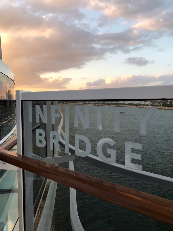 The Infinity Bridge extends from the port side of the ship over the water