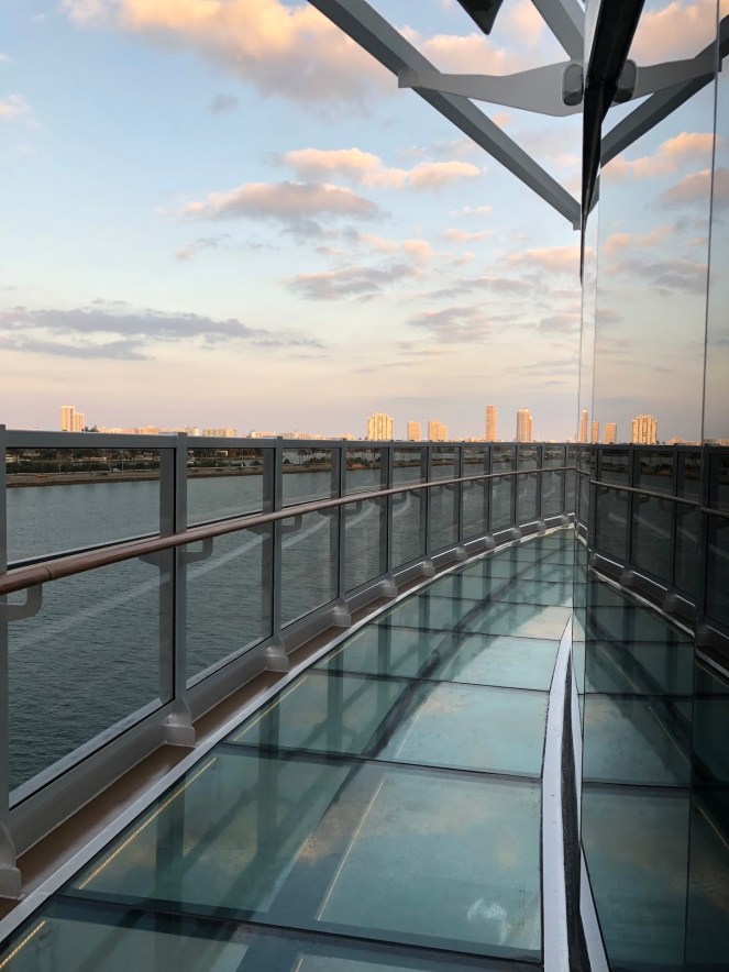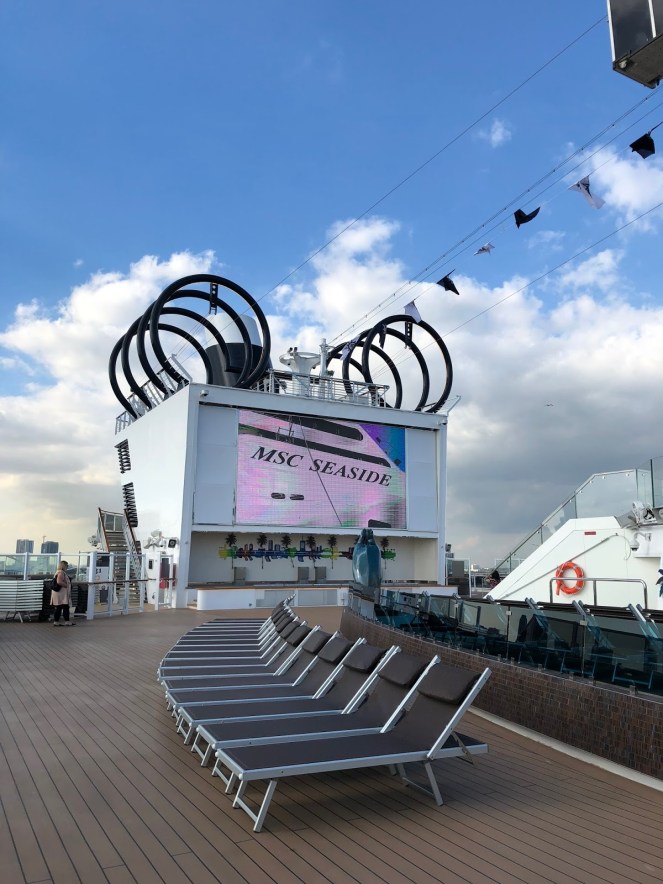 Afterward, we began exploring the ship. The MSC Seaside is beautifully designed and well appointed. The exterior is inspired by Miami architecture and boasts the highest ratio of outdoor space per passenger than any other cruise ship. Hence the tagline, The Ship That Follows the Sun. Seaside’s purpose is to provide the best possible guest experience in warm and sunny weather conditions.