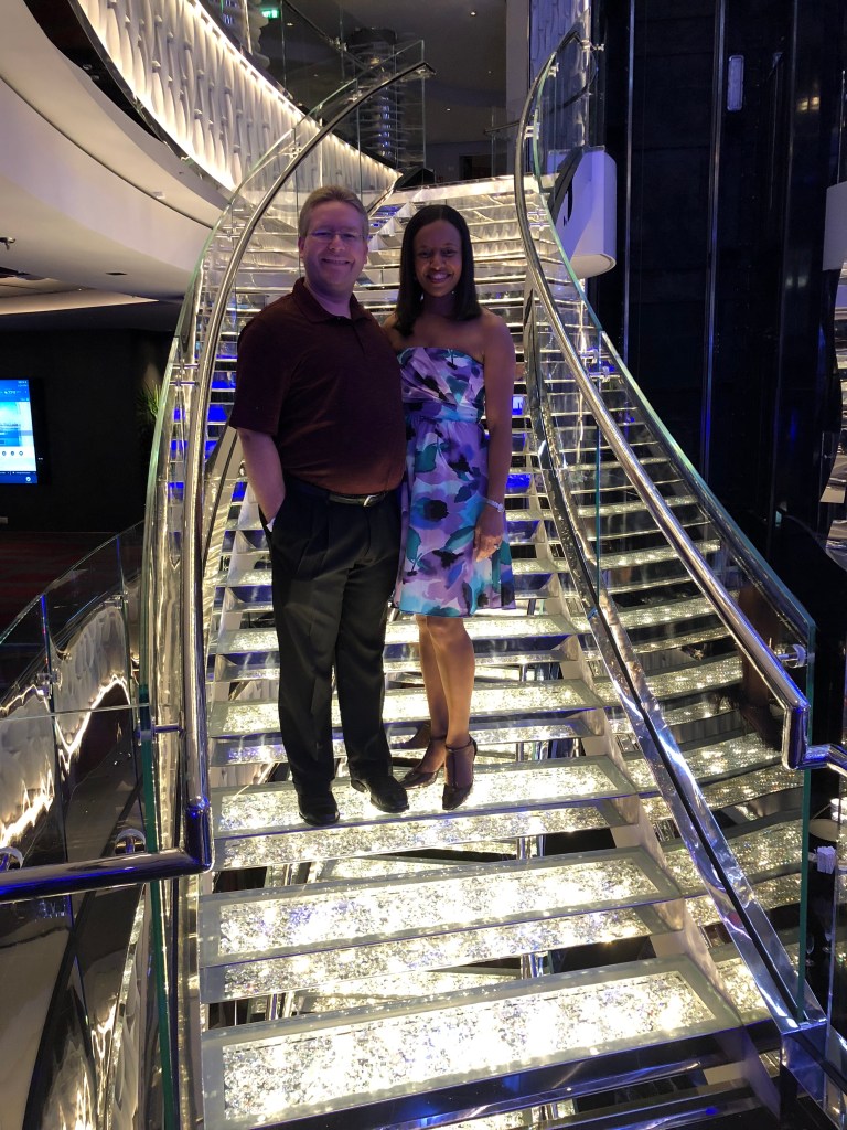 Following dinner, we explored the ship a little more. In the background, we could hear singing from the 70’s party, which we’d planned to attend but missed because we were souvenir shopping. (About that, now that the ship was sailing – for a few hours anyway near Bimini in The Bahamas- the shops were open.)