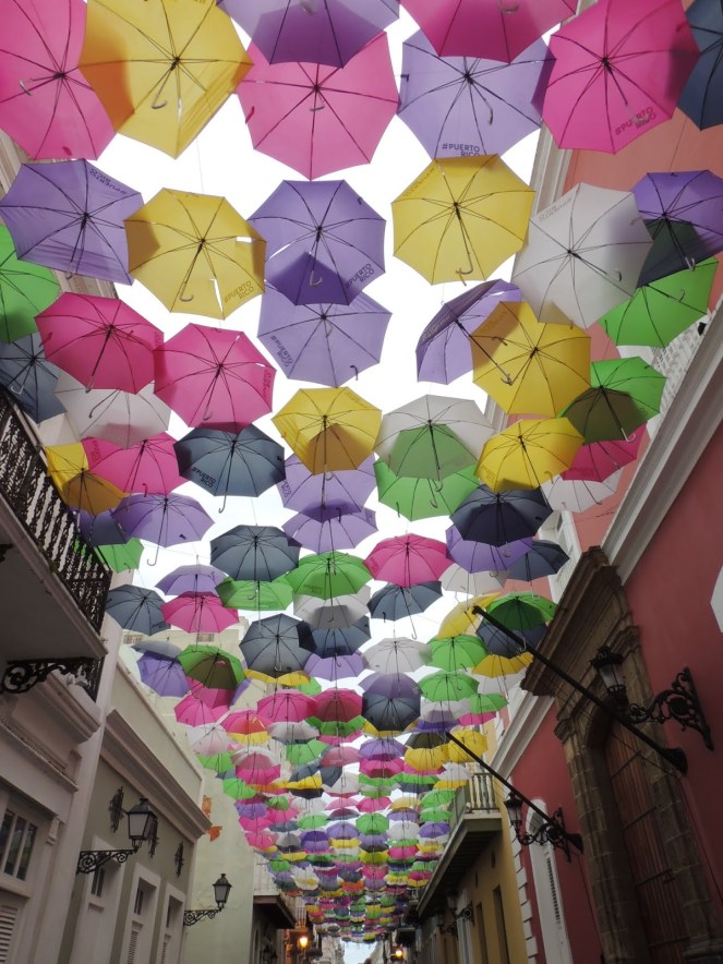 This iconic shot is on La Fortelaza de PR. Colorful umbrellas cover the street and it is a selfie magnet!