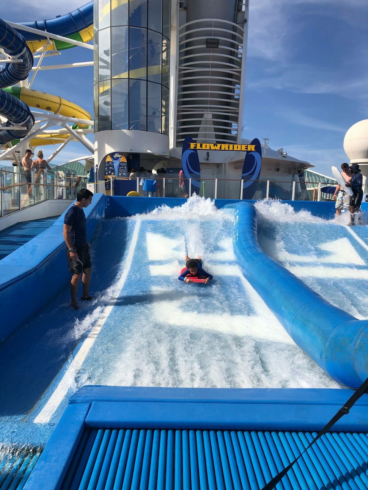 Not so with Flow Rider – the 40 ft surf simulator. The line looked as though it stretched on for miles. Because each rider got 3-5 minutes, it seemed to take forever. Stinky and Blinky didn’t get to ride on Day 7 because their category (52″ boogie board) timed out. That was a huge bummer! They tried again on Day 8, lining up early enough to make sure they didn’t lose their opportunity again. After a nearly two-hour wait, they were all smiles. Both described it as extremely difficult, but fun. However, they preferred The Perfect Storm – no doubt due to the shorter lines.