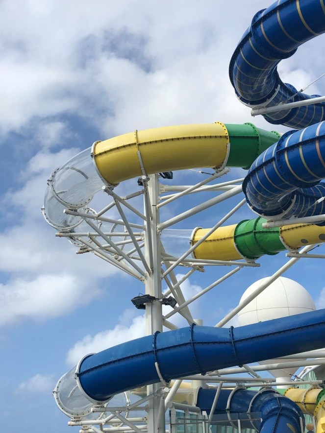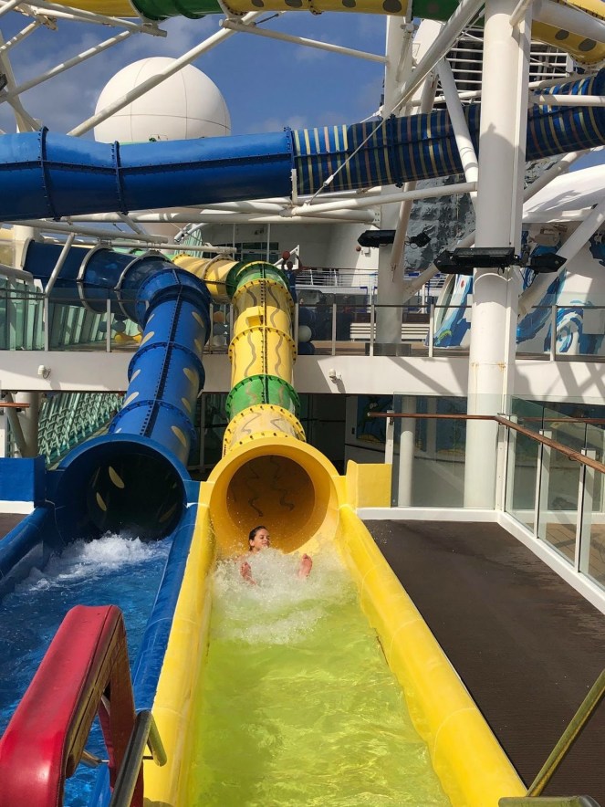 There were still so many things we wanted to do on board Royal Caribbean’s Adventure of the Seas, we were looking forward to two sea days. First up, The Perfect Storm – three stories of twists and turns to the bottom of dual-racer slides Typhoon and Cyclone. This was by far Stinky and Blinky’s favorite, and was on repeat. If you squint just right, the blur coming down the slide is Stinky. The DH and I even joined in on the fun. Although the lines were crazy – you know because thousands of guests were stuck on a ship in the middle of the Atlantic Ocean – it moved quickly.