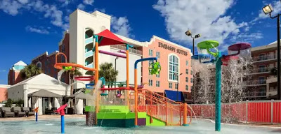 The Embassy Suites Lake Buena Vista is an ideal location for a long stay in Orlando. It has a resort-style pool, cabanas, outdoor movies, and patio dining. Inside, the rooms are spacious with separate sleeping quarters for the parents, and a kitchenette.