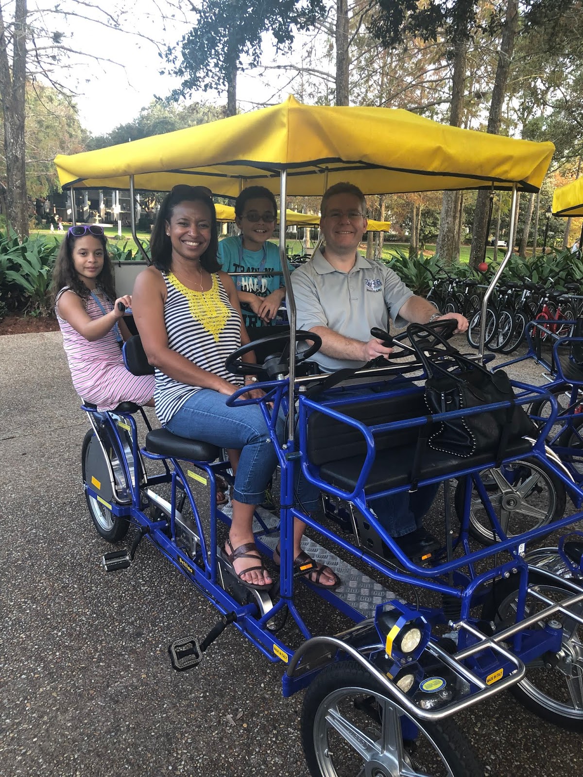 Riverside is much larger than French Quarter. We used this as an opportunity to rent a surrey. Stinky and Blinky weren’t quite tall enough to help us cycle. But they got to chip in near the end by getting out and pushing us over a small hill. It was hysterical!