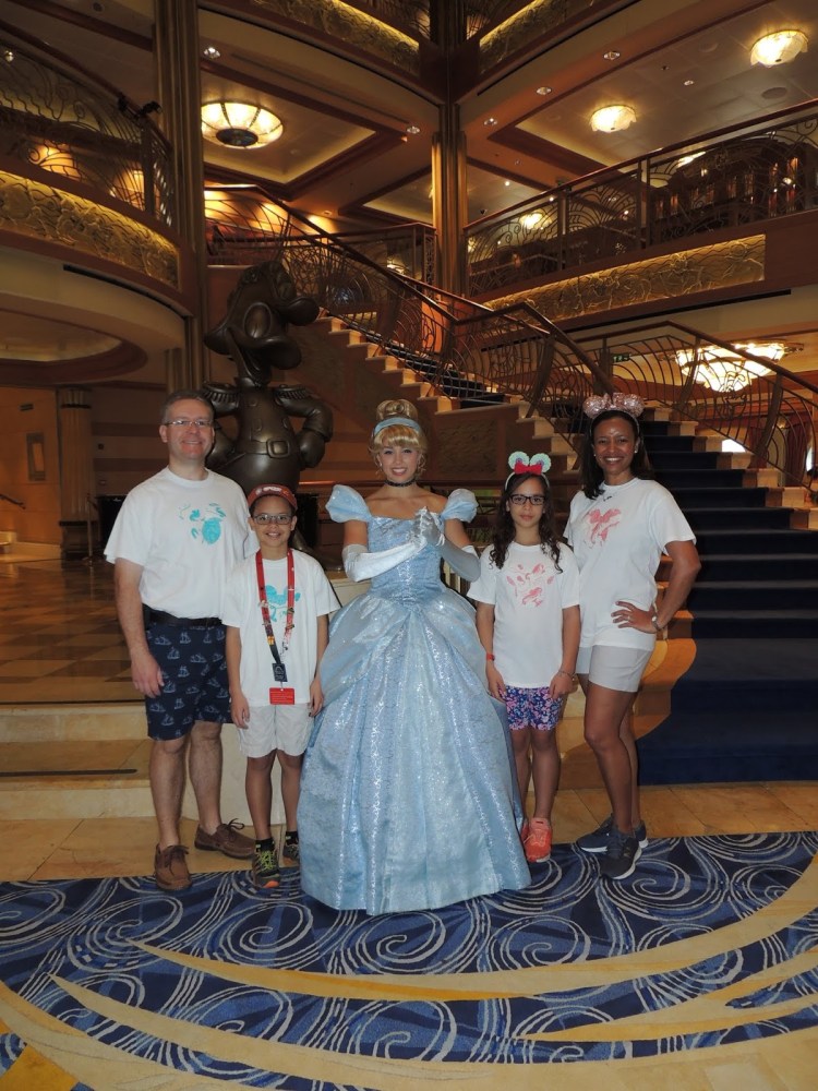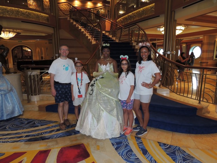 Next we headed to the atrium for the Princess Gathering. We met Rapunzel, Belle, Cinderella, and Tiana (same Tiana as the day before, and the same actress appears as Tiana in the show Disney’s Believe; the DH called her the hardest working princess on the ship).
