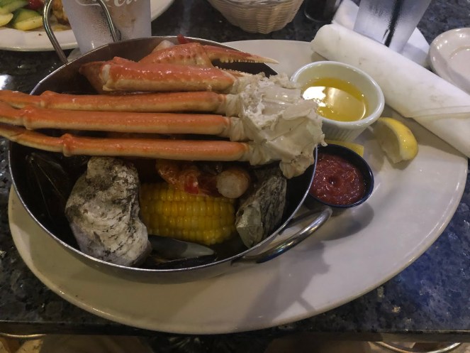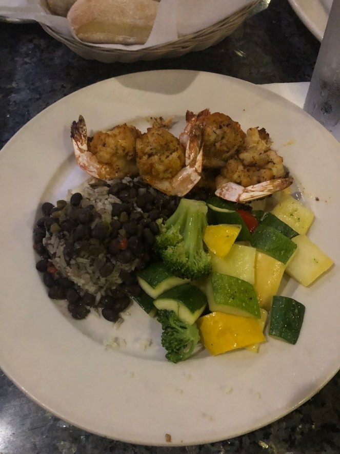 Instead of waiting 2+ hours at a sit-down restaurant, Grammy, Stinky and Blinky opted for fast food at the hotel. The DH and I waited – in the rain no less – for a table at Black Marlin. Oh boy, was it worth it! This was hands down, one of the best seafood meals I’ve ever had! And remember, I’m from the islands.