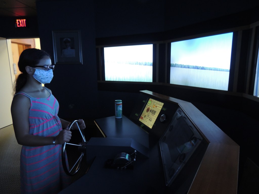 Back downstairs, the kids had the run of the Simulation Room. Using the same technology the Navy, Maritime Colleges and Maritime Training Centers use, they were able to drive a Coast Guard vessel and barge.