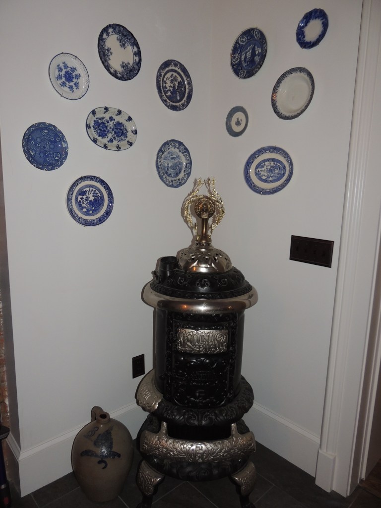 The kitchen is modernized to host small social gatherings. I adore all things blue and white, and this plate wall in the corner caught my eye!