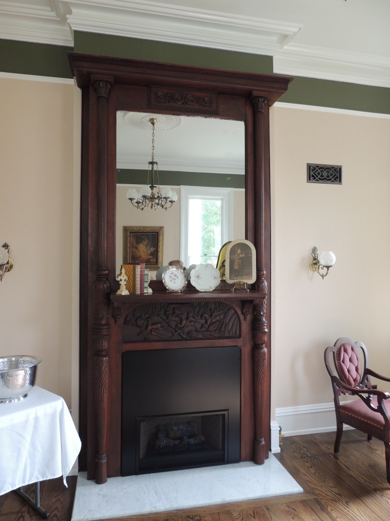 This sunlit room features an ornate, hand-carved fireplace of German craftsmanship, and the most beautiful hinges I have ever seen!