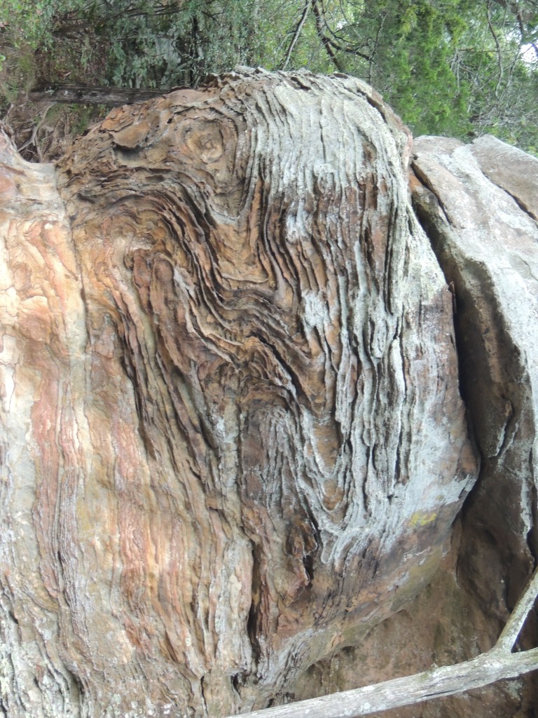 On the opposite side, are bizarre bands. These are swirls and rings on the rocks that were formed when this sandstone (which was underwater at the time) was saturated with groundwater mixed with iron. Over time, chemical changes caused the iron to solidify as rust between the rock particles. As the sandstone weathers, the stronger raised dark bands are more pronounced.