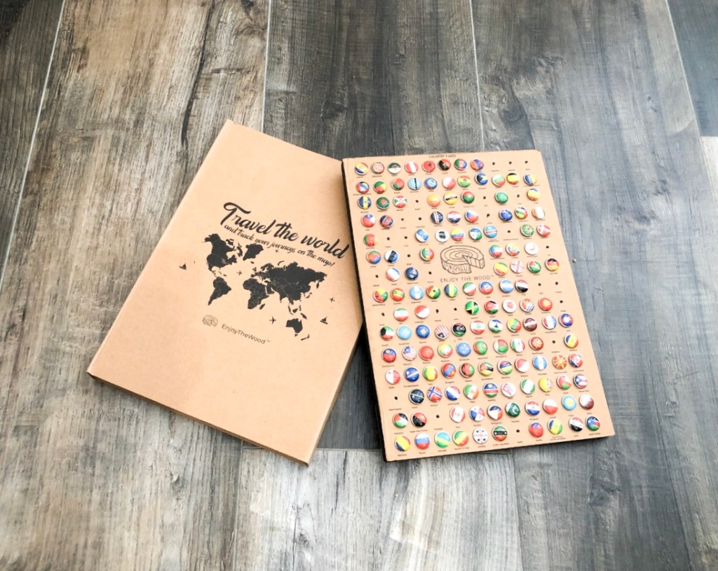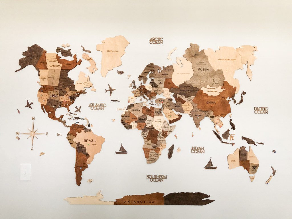 After mulling it over for months, the DH and I decided to purchase a 3D Wood World Map Wall Art by Enjoy the Wood. We were particularly drawn to the warm, multi-tones, and the ability to customize it. We upgraded to include Antarctica, country names and capitals, airplane push pins and country flag pins.