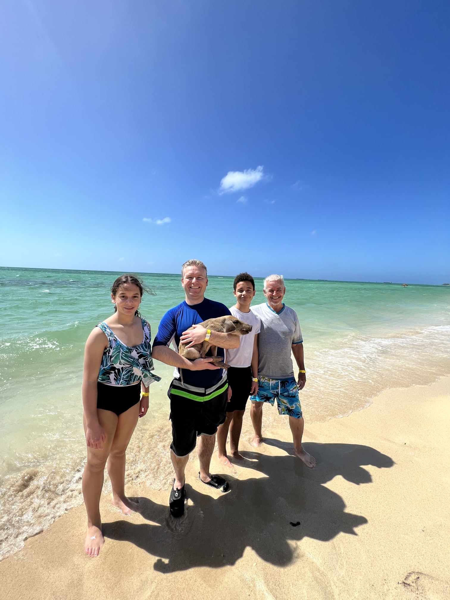 At the appointed time, the pigs were released from their pen and stormed the beach to greet their eager guests. There were boars, sows, and piglets of all sizes. The handler taught us hand signals that the pigs understand mean I’m frightened and food. We fed them fruit, got to hold the medium-sized pigs (Sasha was our favorite), and take as many photos as our hearts desired.
