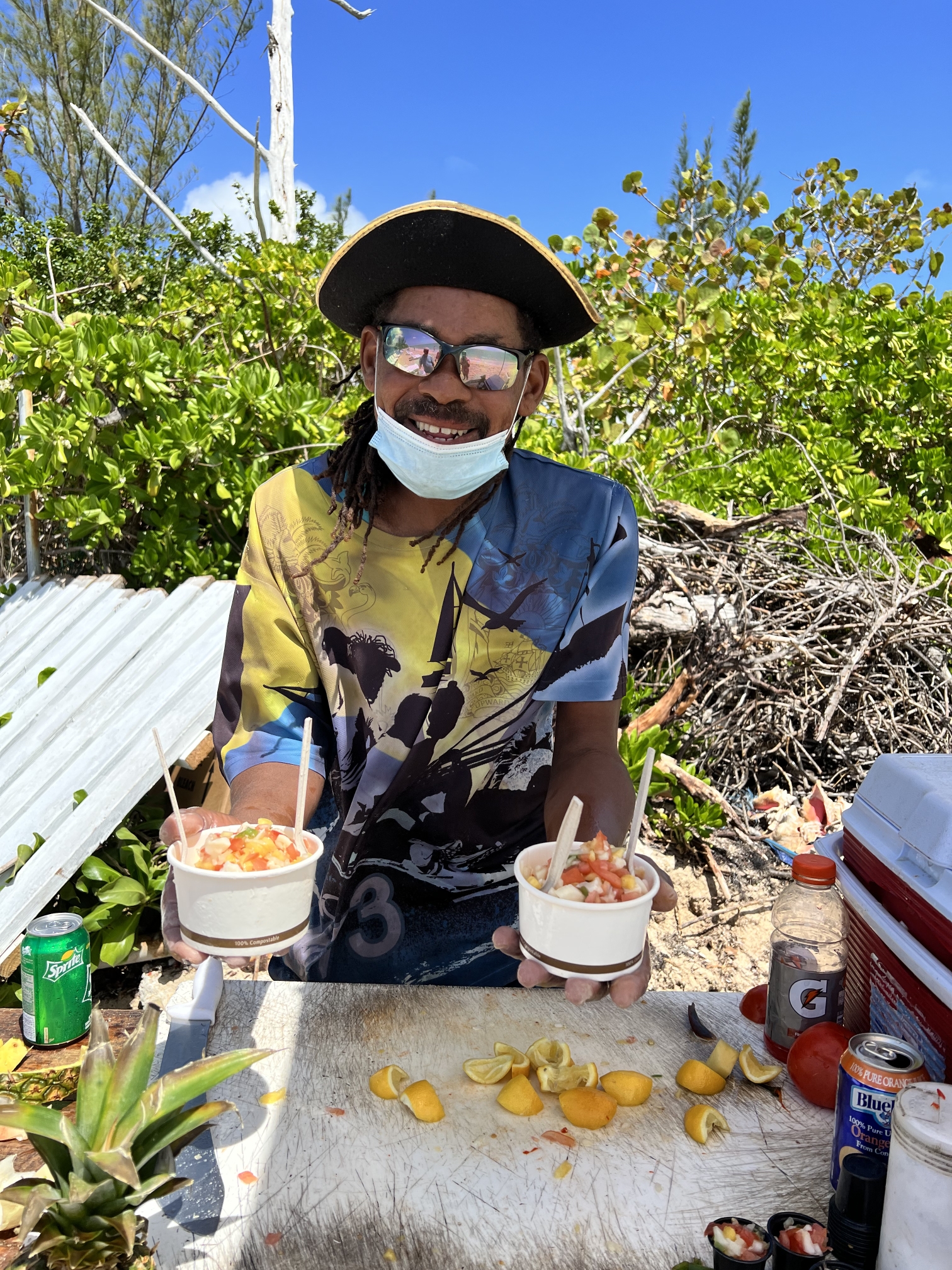 Fresh tropical salad is available for purchase on the beach. And there is a cash bar on sight, which became the hangout after a morning of activities.