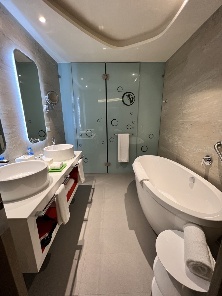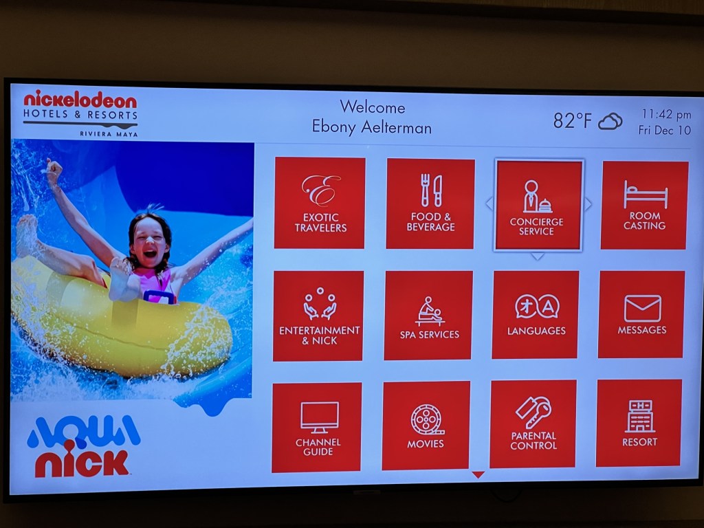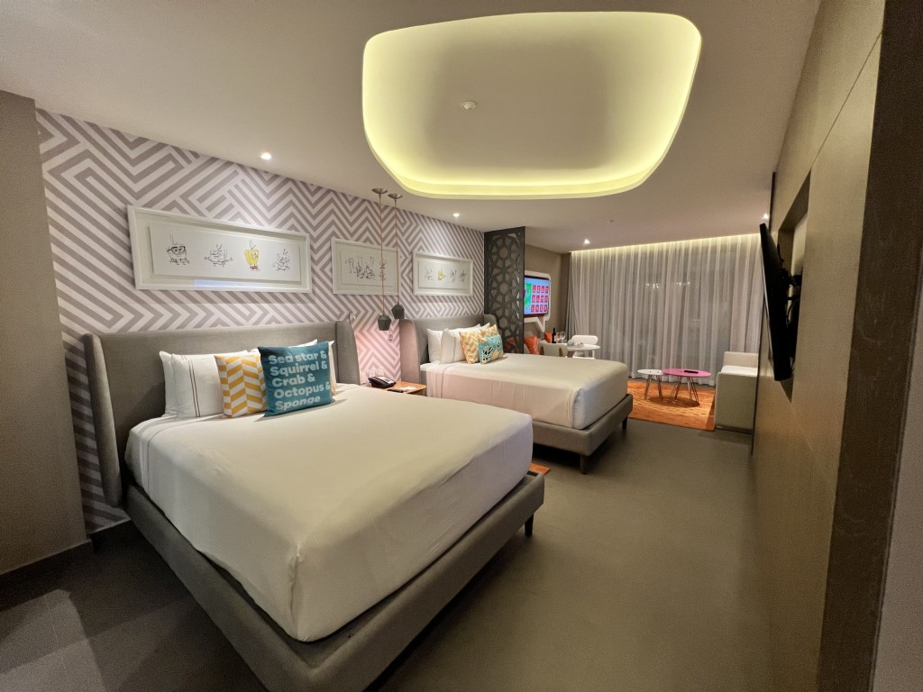 For the first half of that trip, we were based at the all new Nickelodeon Hotels & Resorts Riviera Maya. This sprawling family-friendly, all-inclusive property is as cool as can be! And brand new! We stayed in a Swim-Up Oceanfront Pool Deck Level Queen Suite which offers 2 Queen Beds, a Pull Out Sofa Bed, and 2 bathrooms. Of course we toured the entire property, including the impressive Lair Suite.