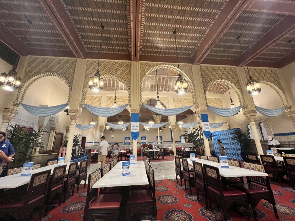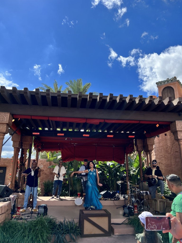 It was particularly warm on the day the DH and I ventured into EPCOT. We were very happy I preregistered for the Florida Blue Medicare Lounge where we could cool down and hydrate. The lounge is housed in the former Restaurant Marrakesh in the Morocco Pavilion. At check-in you’re given one cooling towel per family. Inside is climate-controlled, with a variety of infused waters and teas. While there, we were offered reserved seating for an Eat to the Beat Concert later that evening.