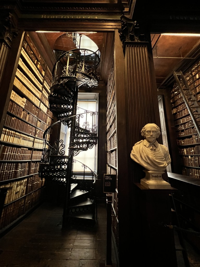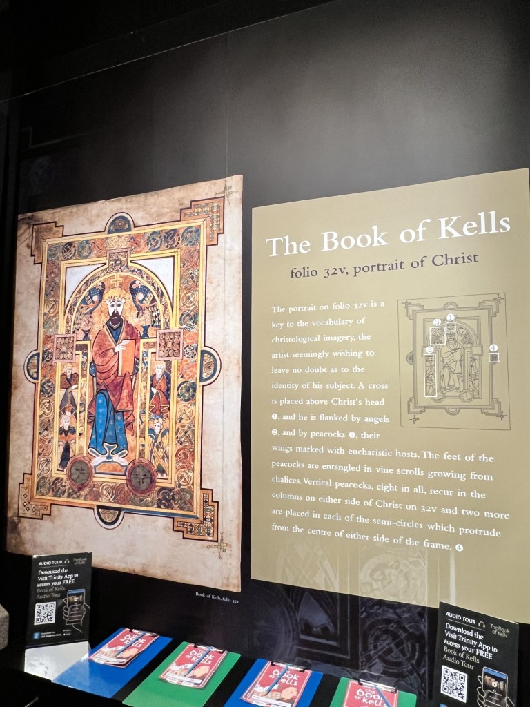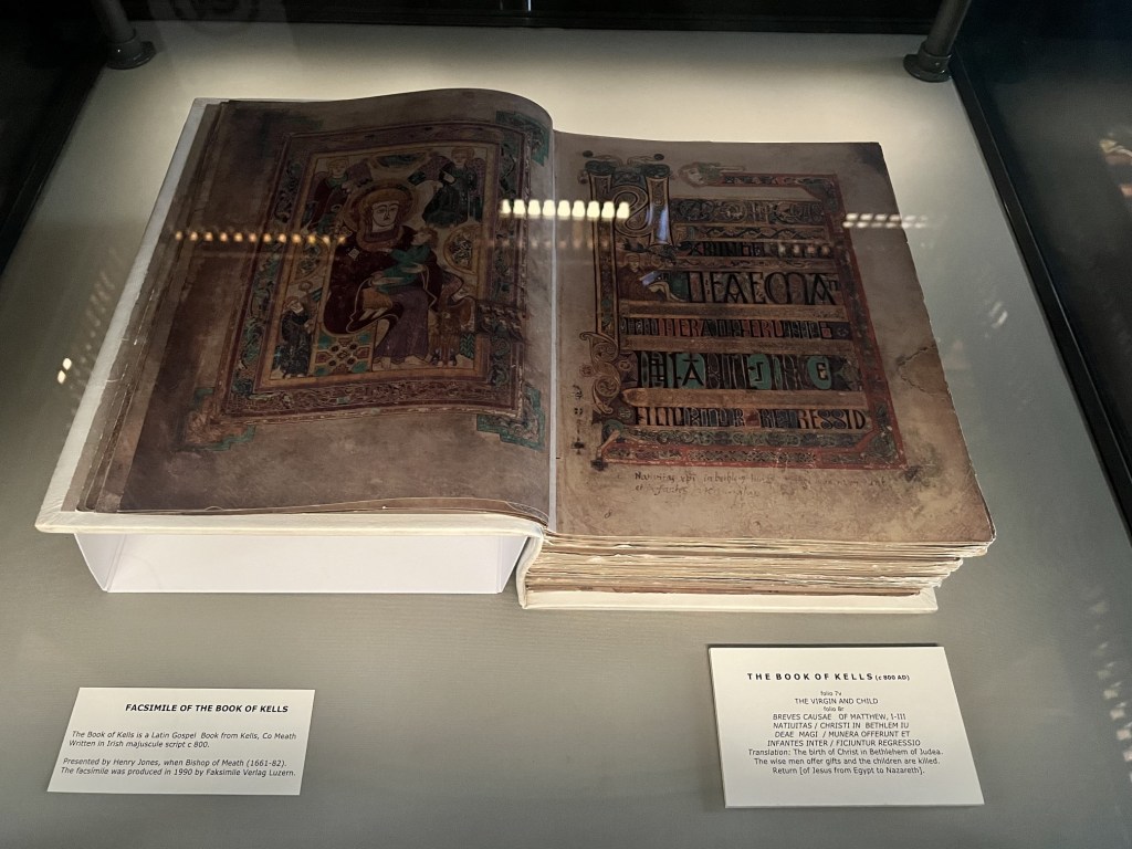 At Trinity College, we had the opportunity to tour an exhibit about the Book of Kells, and even see the famous book in the treasury. Printed on vellum circa 348AD, the Book of Kells illustrates the four gospels of the New Testament, and is believed to be the oldest book in the world. Photographs were not allowed of the original, but there is a facsimile in the library. The exhibit details how the book was made, the importance of symbolism in the illustrations, and the extensive preservation methods employed.