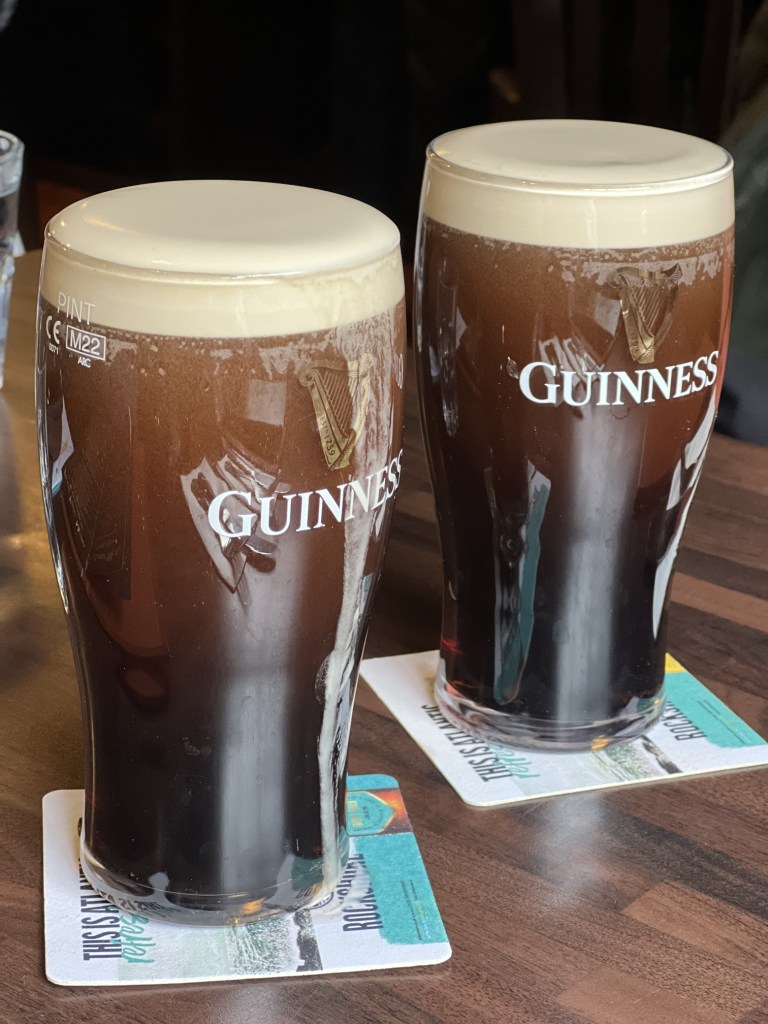 Then we were off to the Guinness Storehouse. Located in the heart of the historic St. James’s Gate Brewery, the Storehouse is a seven-story building that offers visitors a fascinating insight into the history and production of Ireland’s most famous beer. The highlight of the visit is the Gravity Bar, located on the seventh floor, which offers stunning panoramic views of Dublin’s skyline and a complimentary pint of Guinness. The Storehouse also features a range of interactive exhibits, including a virtual brewing experience and a tasting room where visitors can sample a variety of different Guinness beers. The building itself is an architectural masterpiece, with its glass atrium and iconic pint-shaped exterior that is visible from miles around.
