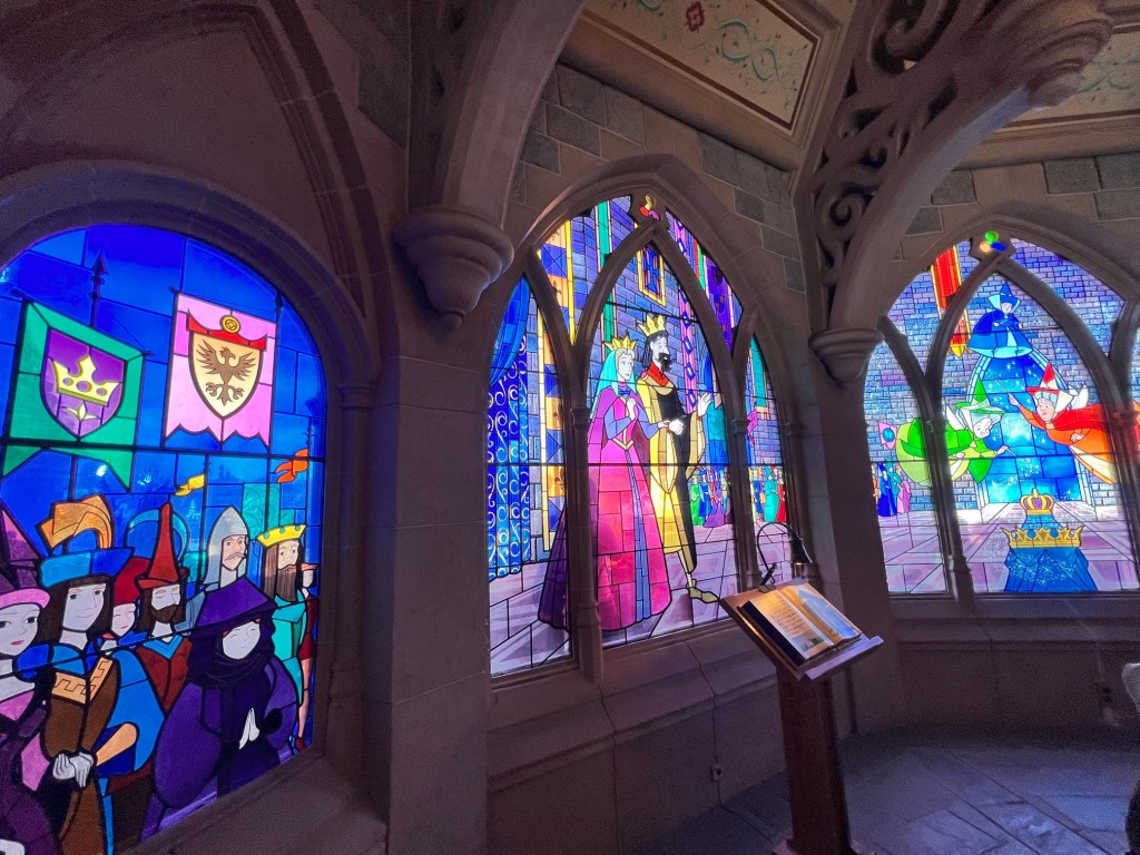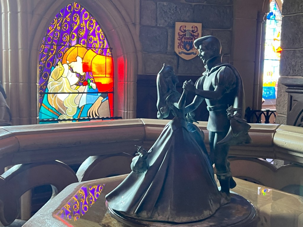 At Disneyland Paris, guests are able to explore the inside of the castle. There’s an upstairs viewing platform with amazing views of the park. Pay attention to the stained glass on the second level. It tells the story of Sleeping Beauty.