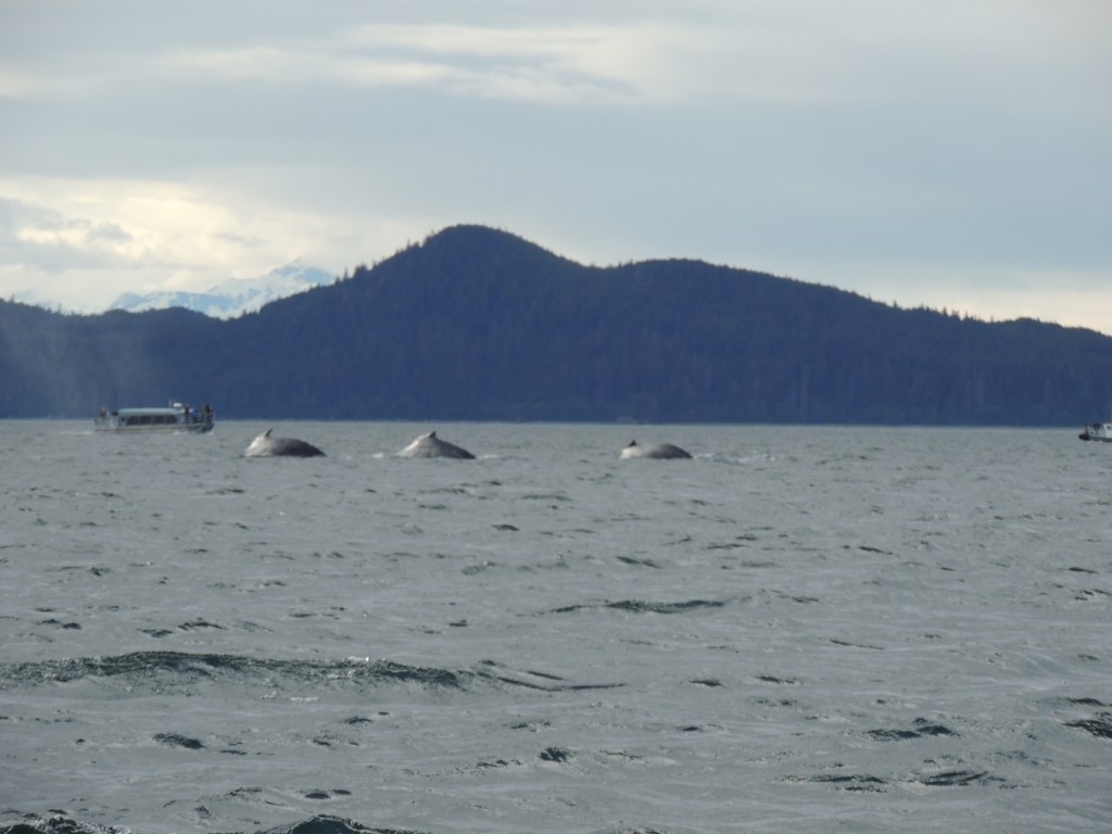 Our guided hike warmed us up quickly. The highlight was the view of Mendenhall Glacier seen above. Next, we boarded a vessel and were off to search for whales. And boy, did we find them! We learnt that whales are identified by the distinctive markings on their flukes. We came across a humpback pod, and the Captain pointed out Mama Flame, and her calf Sizzle.