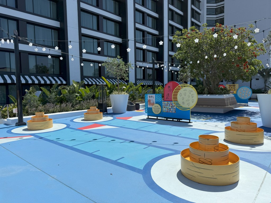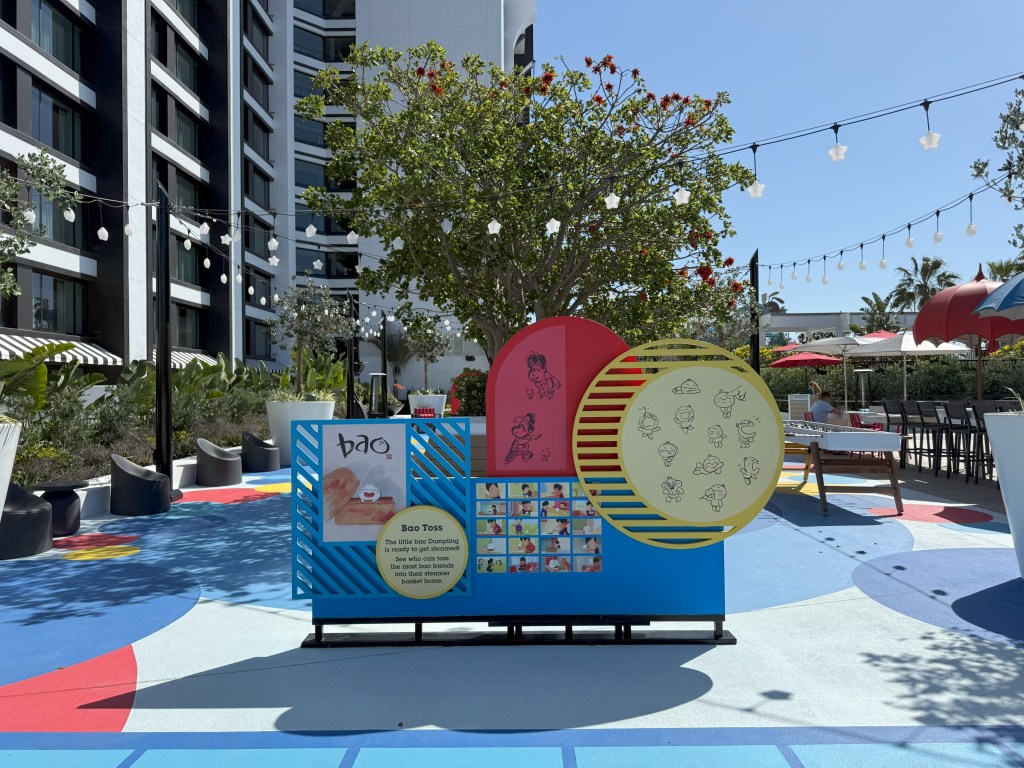 Pixar Shorts Court by the pool deck is an interactive play area for littles where they can toss bean bags inspired by bao into steamer baskets, and push La Luna stars across a shuffleboard.