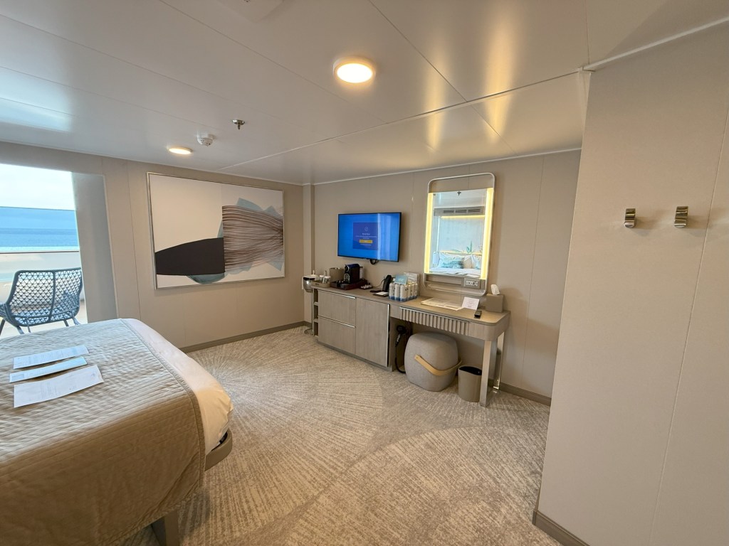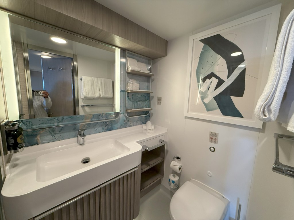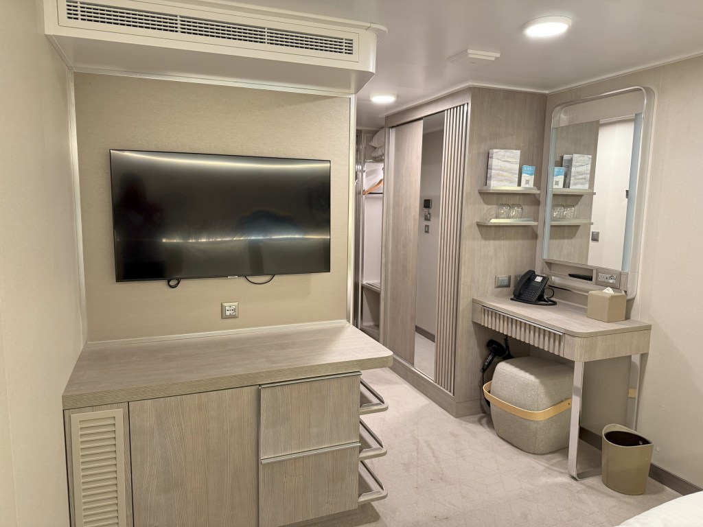 For this sailing, we chose a forward Family Suite with a Large Balcony. The suite featured a queen bed and a double sofa instead of an upper and lower berth, so our son enjoyed his own interior cabin just a few doors down. Both rooms were bright, airy, and beautifully appointed with a contemporary design that felt more like a luxury hotel than a cruise cabin.